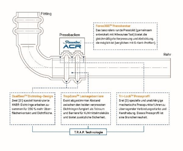 ACR Copper Press ist in den Abmessungen von 1/4“ bis 1 3/8“ Außendurchmesser erhältlich. Die Verpressung erfolgt auf jeder Seite einmal mit Backen oder Schlingen mit CR-Profil.