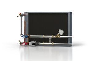 Wolf hat im „KG Top“ auf Kundenwunsch werkseitig ein druckunabhängiges Zweiwegeventil ohne Bypass verbaut. Damit ersetzt diese Lösung die herkömmliche Kombination aus Dreiwegeventil, Bypass und einstufiger Erzeugerpumpe. Bei Teillastbetrieb passt eine drehzahlgeregelte Erzeugerpumpe, gesteuert über bauseitige Sensorik, den Volumenstrom automatisch an. Dies reduziert die Leistungsaufnahme und thermische Verluste gegenüber klassischen Bypass-Lösungen. Das Zweiwegeventil gleicht Druckschwankungen aus und ermöglicht einen gleichmäßigen, bedarfsgerechten Durchfluss durch das Heiz- bzw. Kühlregister. Ein hydraulischer Abgleich entfällt. Die Auslegung und Einbindung in die bauseitige Verrohrung wird dadurch vereinfacht. Die integrierte Hydraulik-Schaltung ist über den RLT-Konfigurator von Wolf verfügbar.