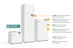 Mit einer Propan-Wärmepumpe für die Innenaufstellung bietet M-Tec ein modulares System mit bis zu 26 kW Heizleistung an. Die Lösung basiert auf einem Stapelkonzept, das bis zu vier Wärmepumpenmodule kombiniert. Jede Einheit bleibt unterhalb der sicherheitsrelevanten Kältemittelgrenze von 150 g Propan (R290). Auf zusätzliche Lüftungskonzepte oder Gasdetektoren kann dadurch verzichtet werden. Die Wärmepumpe eignet sich für Ein- und Mehrfamilienhäuser, Bürobauten sowie Sanierungen. Bis zu 78 kW Heizleistung sind durch eine dreifache Kaskadierung mehrerer Baugruppen möglich. Ein integrierter Heizstab deckt Spitzenlasten ab. Kühlung kann sowohl aktiv als auch passiv erfolgen. Ein intelligentes Quellenmanagement erlaubt den gleichzeitigen Einsatz unterschiedlicher Wärmequellen wie Erdsonden, Eisspeicher oder PVT-Kollektoren. Ein interner Mischer regelt dabei Quellentemperaturen zwischen -25 °C und +80 °C. Die Wärmepumpe ist in das eigene Energiemanagementsystem „E-Smart“ integrierbar, lässt sich aber auch mit externen Systemen kombinieren. Die Verdichter arbeiten geräuscharm, und die Steuerung regelt alle Kältekreise zentral.