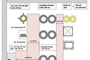 Ein Abschottungssystem sollte vielseitig sein, insbesondere dann, wenn es im Gebäudebestand zum Einsatz kommt. Von Vorteil ist dabei, dass sich die Verarbeitung von „Armaflex Protect“ kaum von der Verarbeitung herkömmlicher elastomerer Dämmstoffe unterscheidet. Zudem kann die Brandschutzbarriere zueinander im „Null“-Abstand installiert werden. Gemäß ETA sind lediglich bei den Rohrdimensionen > 89 mm Abstände von 100 mm einzuhalten. Diese Abstandsregelungen sind insbesondere – aber nicht nur – bei nachträglichen Abschottungen von Vorteil, da die Platzverhältnisse hier oft sehr eng sind. Auch wenn viele der angebotenen Systeme mit einem „Null“-Abstand „ausgestattet“ sind, sollte dies nicht als Einladung verstanden werden, Leitungsanlagen gleich ohne Abstände zu planen. Vielmehr soll es dem Fachhandwerker in Ausnahmefällen ermöglichen, eine Rohrabschottung aus brandschutztechnischer Sicht auch ohne Abstandsrestrisiko herstellen zu können.