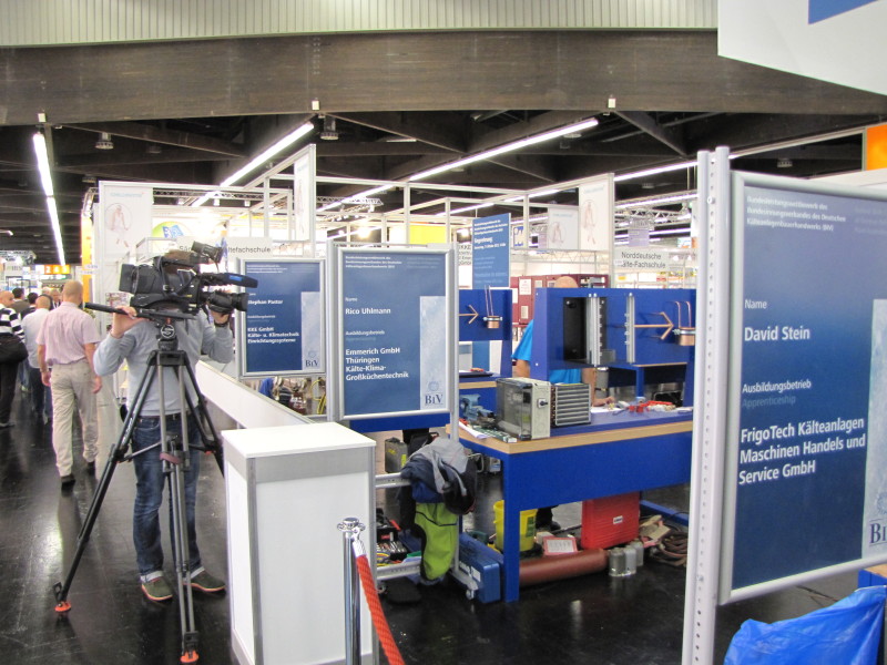 Es hat schon eine gewisse Tradition, dass der Bundesleistungswettbewerb im Chillventa-Jahr auf der Messe stattfindet. Unter den wachsamen Augen der Messebesucher mussten die Landessieger ihr Können unter Beweis stellen. Insgesamt elf Gesellen errichteten während der Messe eine funktionsfähige Kälteanlage. Die Aufgabe war dabei besonders reizvoll und das leibliche Wohl der Teilnehmer stand im Mittelpunkt. Mit einer Anlage galt es ein kleines Bierfässchen zu kühlen und gleichzeitig eine Dose Würstchen zu erwärmen. Am dritten Tag wurden die drei besten geehrt: Bundessieger wurde Julian Walz aus Baden-Württemberg, der zweite Platz ging an Stephan Pastor aus Sachsen, den dritten Preis sicherte sich Dominik Werkshage aus NRW.