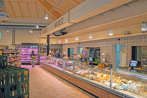 Nach jahrelanger Planung stand Anfang 2019 schließlich der Bebauungsplan. Und dann ging alles ganz schnell – am 28. Mai 2020 wurde der neue Hofladen eröffnet. Mit einer nahezu verdoppelten Verkaufsfläche von knapp 800 m² und weiteren 700 m² für Kühlhäuser, Lagerflächen, Büros, Sozialräume und Unterstellplätze für die Marktwagen. Errichtet wurde das Gebäude auf einem Grundstück direkt vor dem Eingang des Hofgeländes. So müssen die knapp 400 Kunden pro Tag nicht mehr auf den Hof mit seinen schmalen Wegen fahren, wo sich zuletzt alles getroffen hat: Kunden zu Fuß, mit Fahrrad, Kinderwagen, Autos, Lieferfahrzeuge … Sie können nun ungestört auf dem großen Parkplatz des neuen Ladens parken.