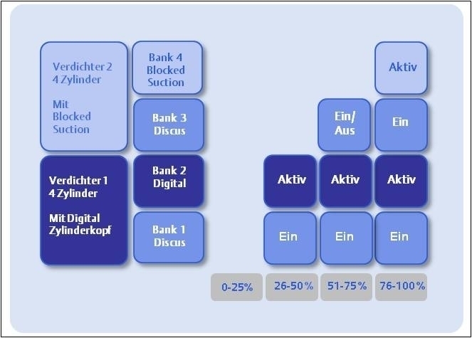 Bild 2 zeigt exemplarisch das Regelungskonzept für die Version Digital und ZBA. Dabei wurde Verdichter 1 als Digitalverdichter ausgeführt, bei dem eine Zylinderbank normal betrieben und die zweite als Digitalkopf ausgeführt waren. Verdichter 2 hatte eine Zylinderbank in Normalausführung und zur Leistungsregelung eine Zylinderbank mit Zylinderbankabschaltung. Je nach Lastbereich erfolgte die Ansteuerung der einzelnen Verdichter und Zylinderbänke unterschiedlich. Im Lastbereich 50 bis 75 % wurde beispielsweise die erste Zylinderbank des Verdichters 1 kontinuierlich betrieben, während die zweite mit hoher Zyklenzahl zu- und abschaltete. Die Zylinderbank 2 des zweiten Verdichters kam nicht zum Einsatz, während die erste Zylinderbank durch Ein-/Ausschalten des zweiten Verdichters zu- bzw. abgeschaltet wurde. Diese Betriebsweise regelte die gelieferte Kälteleistung kontinuierlich zwischen 51 und 75 %.