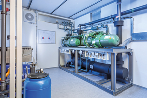 Auch nicht ganz üblich, aber immer häufiger gewünscht, ist die Integration der kompletten Anlage in einen Container – genauer gesagt in einen Doppelcontainer. Das bietet gleich mehrere Vorteile: Es wird kein Platz in der Produktion benötigt, die Anlage wird komplett montiert und anschlussfertig geliefert. Die Komponenten für die Außenaufstellung (Kondensator und Freikühler) sind ebenfalls bereits auf dem Containerdach montiert.