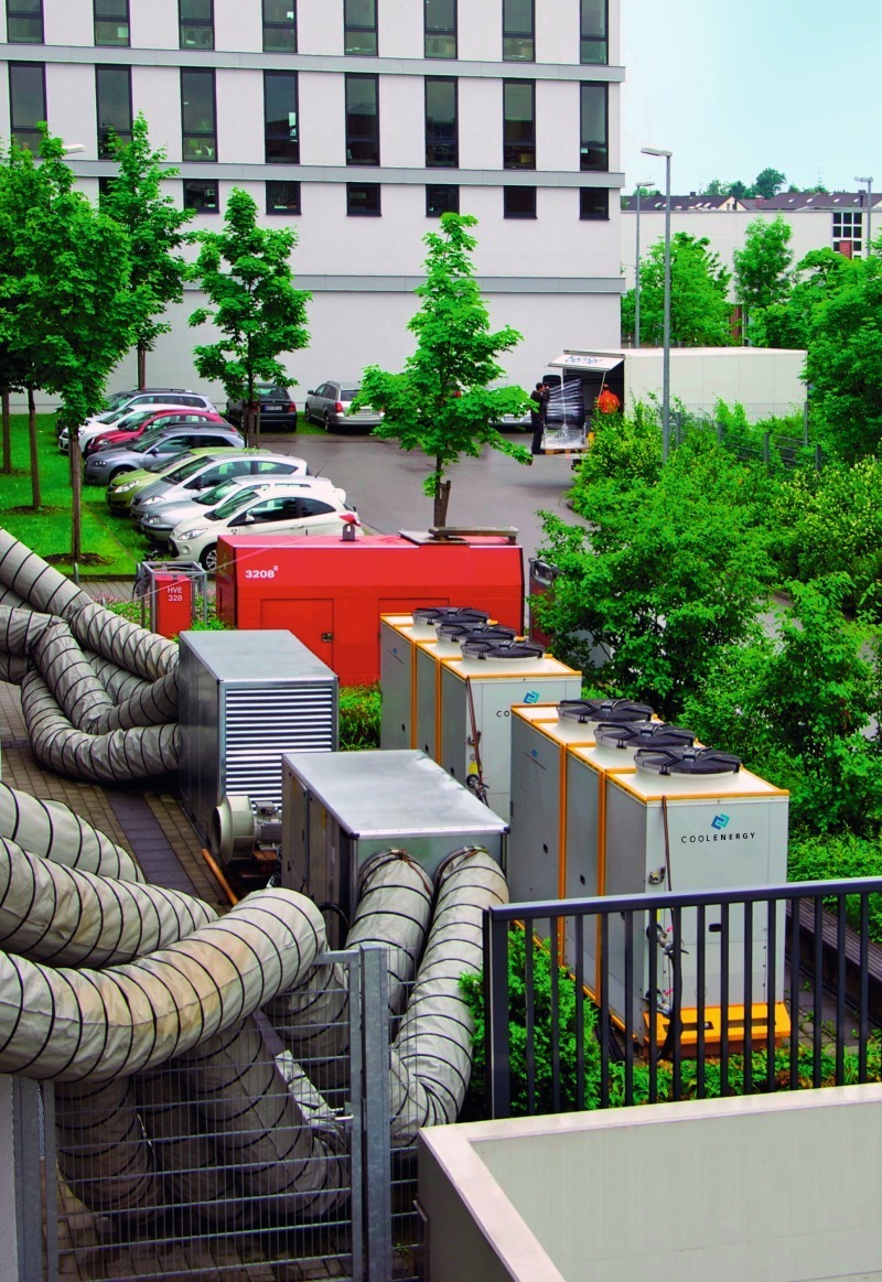 Bei der im Außenbereich positionierten Zusatzstromversorgung musste man, genau wie bei der Kaltlufterzeugung, Geräuschemissionen vermeiden. Der Arbeitsablauf im gegenüberliegenden Bürogebäude sollte nicht beeinträchtigt werden. CoolEnergy arbeitete deshalb mit einem schallgedämpften Diesel-Elektro-Aggregat mit einer Leistung von 250 kVA und elektronischer Drehzahlregelung.