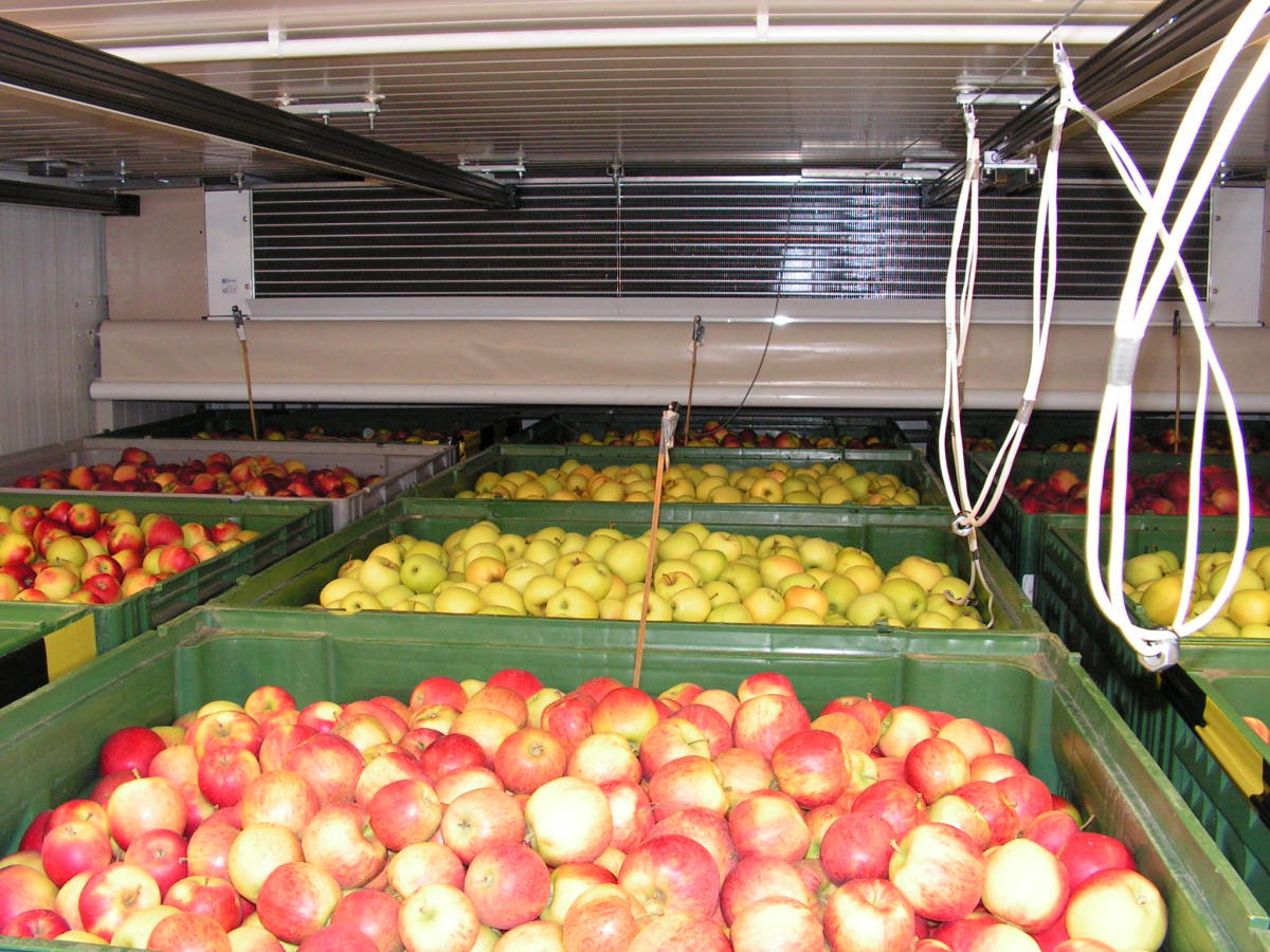 Um den Einfluss reduzierter Luftbewegung auf den Energieverbrauch und die Qualitätserhaltung von Äpfeln zu untersuchen, wurden am KOB über zwei Jahre CA-Lagerversuche durchgeführt, wobei Kühlung mit üblicher Ventilatorleistung (100 %) verglichen wurde mit auf 50 % reduzierter Ventilatorleistung während der Lagerphase nach der Abkühlung. Die Verringerung der Ventilatordrehzahl auf 50 % bewirkte eine Energieeinsparung von 40 % gegenüber üblichem Ventilatorlauf. Die Gesamtlaufzeit der Kühlung wurde um 13 % verringert, möglicherweise auf Grund des geringeren Wärmeeintrags der Ventilatormotoren. Positiv auf verringerten Energieverbrauch wirkte sich auch der Einsatz von EC-Motoren im Vergleich zu AC-Motoren für den Ventilatorbetrieb aus. Die Qualität der Äpfel war nach Lagerung bei verringerter Ventilatordrehzahl nicht beeinträchtigt, d.h. es gab keine signifikanten Unterschiede der Festigkeit, des Masseverlusts und des Zucker- und Säuregehalts.