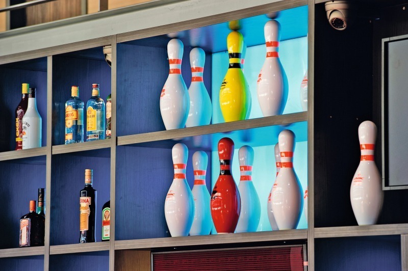 Die zentrale Lüftungsanlage versorgt alle Bereiche des Bowlingcenters, also die große Halle, die Besprechungsräume, das Restaurant und die VIP-Lounges, bis auf einen Billardraum im Obergeschoss. Die konditionierte Frischluft wird in der großen Halle über die von der Decke hängenden Stutzen ausgeblasen. Bei der Innenraumgestaltung wurde versucht, die Lüftungskanäle möglichst funktionell zu betrachten und ansprechend ins Interieur-Design zu integrieren. Hierzu wurden in die Auslassstutzen Leuchten integriert. Von dort verteilen sich dann die Luftmengen gleichmäßig durch den Raum und werden am Ende der Bowlingbahnen wieder angesaugt. Denn hinter den Pindecks befinden sich die gesamte Technik der Bowlinganlage sowie der Lüftungskanal für die Absaugung der verbrauchten Luft.