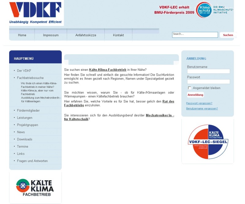 Auf einer neuen Homepage unter alter Adresse präsentiert der Verband Deutscher Kälte-Klima-Fachbetriebe (VDKF) Neuigkeiten und Informationen aus der Branche und für die Branche. Neben aktuellen Informationen aus dem Mitgliederbereich gibt es Hilfen bei der Fachbetriebssuche, Termine, Downloads und Kontaktmöglichkeiten. Die VDKF-Homepage ist unter der Adresse www.vdkf.org zu erreichen.