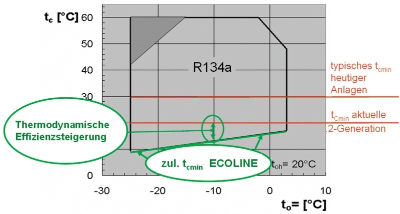 Ergebnisse durch Erweiterung des Einsatzbereiches | Vergleicht man hierzu einen Punkt auf der jeweiligen Einsatzgrenze bisheriger R134a-Verdichter und der „Ecoline“-Verdichterbaureihe, s. Bild 6, stellt sich die Situation wie folgt dar: