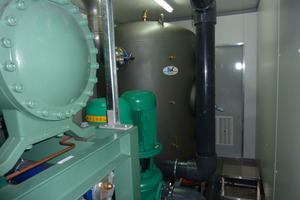 Die Rückkühlanlage zur Kühlung des Testwassers aus dem Test-Center Remscheid bildet eine funktionierende Einheit mit zentral programmierbarer Steuerung (SPS-S7-200) der Kühlwassertemperatur und automatischer Wahl der Kältemaschine oder Freikühler abhängig von der Außentemperatur. Gewählt wurde ein „Frigoline-Verbund“ („FK/4CSW 8593-125Y”, Qo = 1600 kW, to = +10 °C, tc = +45 °C, R134a).
