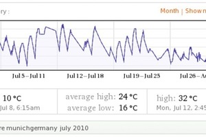 Doch verursacht durch die hohen Temperaturen (Grafik 1) und die hohe Luftfeuchte (Grafik 2), bzw. die vielen extrem schwülen Tage im Sommer, reichte die zur Verfügung stehende Wassermenge nicht mehr aus, um auf den Verkaufsetagen angenehme Raumtemperaturen bei erträglicher Feuchte zu erreichen. Zugleich brach die Leistung der Kühlkassetten wegen der zu geringen Temperaturdifferenz von 9 kW auf 2 kW ein. Oder anders gesagt, die Vorlauftemperatur des Brunnenwassers reichte nicht mehr aus, um die Räumlichkeiten zu entfeuchten, es wurde nur noch gekühlt und dies führte zu einer nicht sehr angenehmen Schwüle in den Verkaufsräumen, was sich natürlich direkt auf die Verkaufszahlen auswirkt.