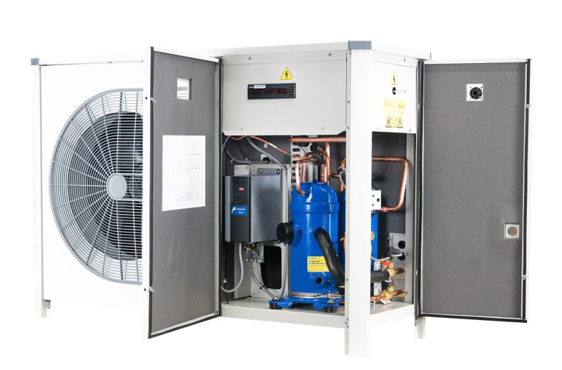Die zweite große Herausforderung ist die sich über das Jahr ständig ändernde Außentemperatur. Bei der Regelung des Verflüssigungsdrucks fließen besonders diese Außentemperatur und der aktuelle Sollwert in die permanente Berechnung des momentanen Referenzwertes für die Verflüssigungstemperatur und damit Lüfterdrehzahl ein. Der Sollwert ist die Differenz zur aktuellen Umgebungstemperatur, z.B. 10 K. Der daraus resultierende Referenzwert entspricht damit zum Beispiel 30 °C (Außentemperatur 20 °C plus Sollwert 10 K). Diese 30 °C werden nun so lange durch Änderung der Lüfterdrehzahl gehalten, bis sich die Umgebungstemperatur ändert. In diesem Fall korrigiert sich der Referenzwert entsprechend. Nicht zuletzt durch diese Maßnahme erreicht „Optyma Plus Inverter“ mit dem Kältemittel R407F einen einmaligen SEPR (Seasonal Energy Performance Ratio = jahreszeitbedingter Energiewirkungsgrad) von 3,84.