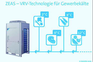 Die VRV-Technik von Daikin ist seit Jahren bekannt und bewährt. Nun erweitert der japanische Hersteller die Einsatzmöglichkeiten der Technik auf Projekte in der Gewerbekälte. „ZEAS“ – schon auf der Chillventa in Nürnberg zu sehen – vereint alle Komponenten in einem System und bietet somit nach Herstellerangaben Vorteile gegenüber den üblichen Verbundanlagen. Bei der Installation sowie bei der Regelung ergibt sich die gleiche Flexibilität wie bei einer üblichen VRV-Anlage.