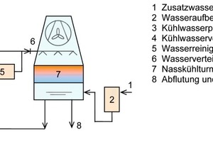 Moderne Ventilatorkühltürme werden vorwiegend in Zellenbauweise, in Reihen- oder Blockanordnung, errichtet (vgl. Bild 7. Als Strömungsführung stehen Gegenstrom und Kreuzstrom (hauptsächlich in Großbritannien und USA) zur Auswahl. Die Nasskühlung ist mit Wasserverlusten infolge Verdunstung, Tropfenauswurf und Abflutung verbunden.