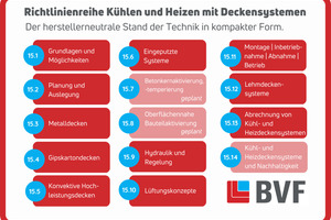 Mit Heiz- und Kühldeckensystemen lassen sich aufgrund der großen aktivierten Oberfläche Raumtemperaturen ausgezeichnet steuern. Die Anforderungen an den Luftaustausch sind durch angepasste Lüftungskonzepte abzudecken. Architektonisch lassen sich Lüftungsbauteile in abgehängte Heiz- / Kühldeckensysteme bis hin zur Unsichtbarkeit integrieren. Die neu erschienene Richtlinie 15.10 des Bundesverbands Flächenheizungen und Flächenkühlungen e.V. (www.flaechenheizung.de) zeigt auf, wie Heiz-/Kühldecken in Verbindung mit Lüftung funktionieren und sich auch gemeinsam als ein System kombinieren und darstellen lassen. Eine abgestimmte Kombination dieser zwei Systeme bedeutet für den Investor, den Nutzer und auch den Baustellenablauf einen Mehrwert.