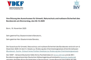 Um den Kampf gegen den illegalen Kältemittelhandel zu forcieren, haben sich der Bundesinnungsverband des Deutschen Kälteanlagenbauerhandwerks (BIV, www.biv-kaelte.de) und der Verband Deutscher Kälte-Klima-Fachbetriebe (VDKF, www.vdkf.de) – mit fachlicher Unterstützung der Experten der Bundesfachschule Kälte-Klima-Technik (BFS, www.bfs-kaelte-klima.de) – in einer gemeinsamen Stellungnahme zum geplanten deutschen Chemikaliengesetz (ChemG) geäußert. Im ChemG werden Kältemittel im Zusammenhang mit der Umsetzung der europäischen F-Gase-Verordnung geregelt; vorrangig geht es um die Verhinderung von illegalem Handel und die Kontrolle der Lieferketten. Durch die Novellierung der F-Gase-Verordnung im März 2024 ist eine Überarbeitung des ChemG erforderlich. Das Bundeskabinett hat die Novelle des ChemG bereits auf den Weg gebracht; diese wird jetzt im Dezember im Bundesrat behandelt – BIV und VDKF haben sich mit ihren Forderungen daher an die Umwelt- und Wirtschaftsminister sowie die Ministerpräsidenten der Bundesländer gewandt. Die Kernaussagen der gemeinsamen Stellungnahme sowie die Stellungnahme selbst finden Sie unter www.t1p.de/KKA6-25ChemG.