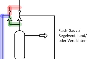 Ein weiteres Anwendungsbeispiel ist das Zurückführen von Öl von einem beliebigen Punkt A im System in den Ölsammler (Punkt B) durch zunutze machen der Entspannung zwischen Ölabscheider (Hochdruck) und Ölsammler. Die Kombinationen in solchen Anwendungen sind vielfältig. Sie dienen in der Regel nicht der energetischen Optimierung des Systems, sondern der Sicherstellung der geforderten Betriebsbedingungen. Die Funktionsprinzipien von Low- und High-Pressure-Lift-Systemen werden im Kapitel 6 „Ejektor-System“ erläutert. Basierend auf diesen Funktionsprinzipien stellt Bild 9 eine mögliche Anwendung von Ejektoren zur Öl-Rückführung dar. Die Regelung der Öl-Rückführung kann analog der in Kapitel 5.3 „Einspritzventil“ beschriebenen Regelkreisen und Messgrößen erfolgen. Auf diese Anwendung wird im weiteren Verlauf des Textes nicht weiter eingegangen.