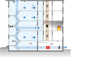 Im Gegensatz dazu ermöglicht der aktiv geregelte Abströmschacht eine erhebliche Reduzierung der Schachtquerschnitte, indem ein im Schacht positionierter Ventilator die Druckverluste überwindet und die Luft absaugt. Eine permanente Differenzdruckmessung und Volumenstromregelung sorgen für die zuverlässige Entfernung der Luft aus dem Brandgeschoss. Zu diesem Zweck wird auf jedem Geschoss ein Differenzdrucksensor installiert. Der Drucksensor wird im Vorraum platziert, während die Druckmessstelle sich vor der Absaugstelle im notwendigen Flur befindet. Im Brandfall wird jedoch nur der Sensor im Brandgeschoss von der Regelung berücksichtigt. Als Absaugventilatoren kommen in der Regel Ventilatoren zum Einsatz, die nach der Bauart von Entrauchungsventilatoren konstruiert sind.