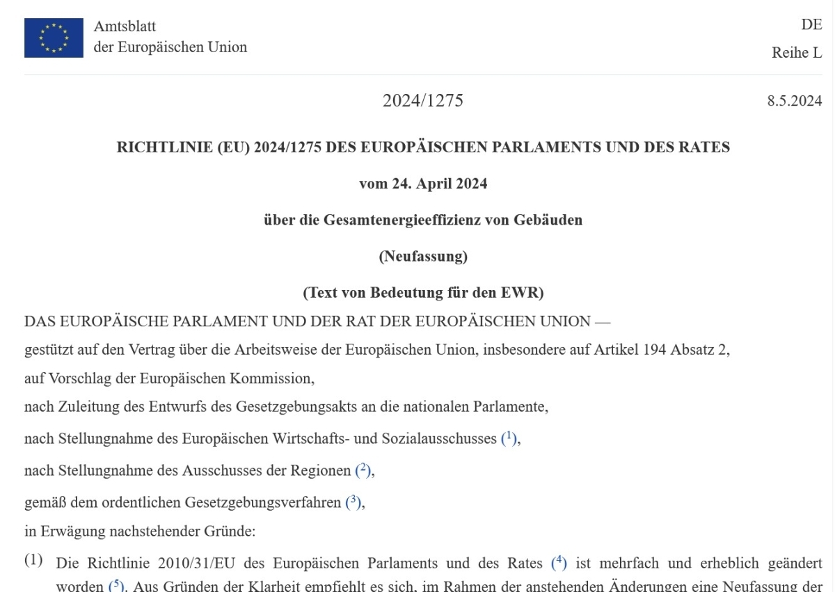 Die Bundesregierung ist verpflichtet, die novellierte EU-Richtlinie über die Gesamtenergieeffizienz von Gebäuden 2024/1275 (EPBD) bis Mai 2026 in nationales Recht umzusetzen. Dazu gehört unter...