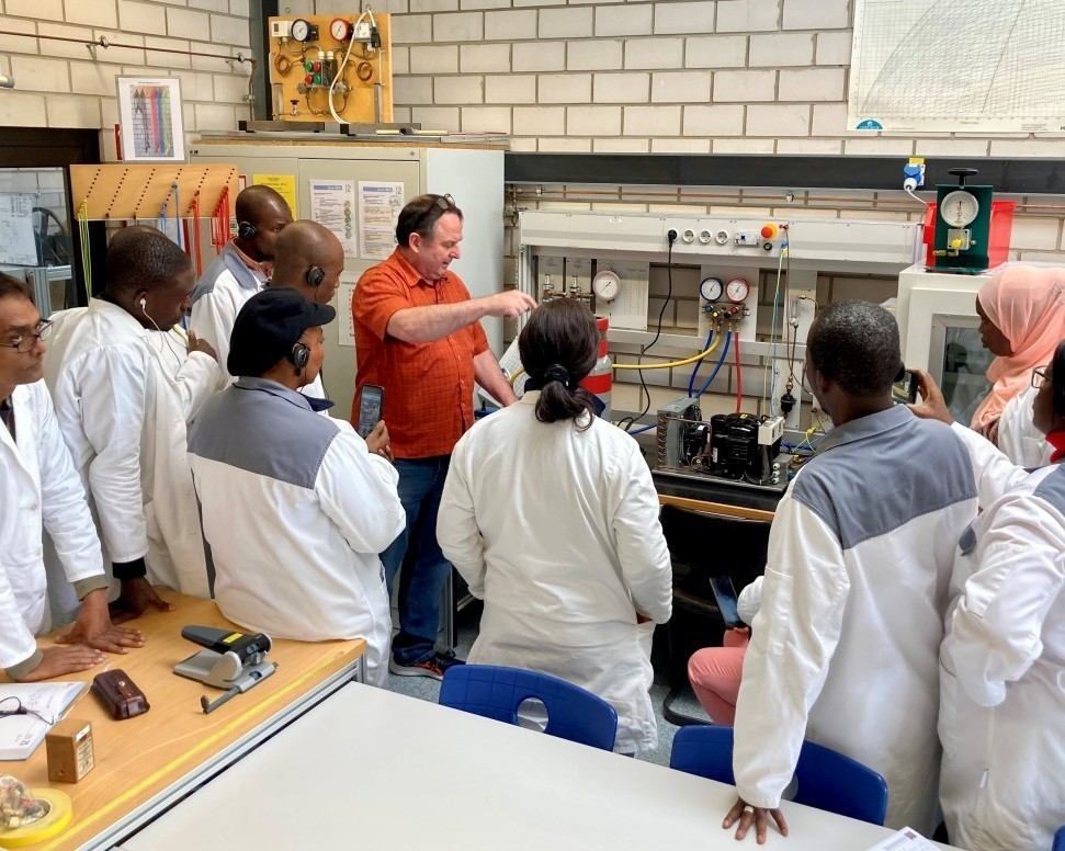 28.04.2023An der Bundesfachschule Kälte-Klima-Technik (BFS, www.bfs-kaelte-klima.de) in Maintal konnten Ende April 15 Frauen und Männer aus Mali, Kamerun, Mauritius, Burkina Faso und dem Senegal zwei Wochen lang ihre Fachkenntnisse im Umgang mit natürlichen Kältemitteln vertiefen. Die im Rahmen des Cool Training-Programms durchgeführte Schulung wurde von erfahrenen BFS-Dozenten begleitet – stets unterstützt von zwei Dolmetscherinnen, die den französisch-sprachigen Teilnehmerinnen und Teilnehmern simultan alle Fachinhalte übersetzten. Die Labore, die umfangreichen Schulungsunterlagen und die Betreuung an der BFS wurden von allen ausdrücklich gelobt.