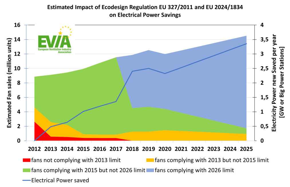 Die Effizienz moderner Ventilatoren ist in den vergangenen Jahren immer weiter gestiegen, auch aufgrund der europäischen Ökodesign-Anforderungen für Ventilatoren (ErP, Verordnung (EU) 2024/1834). Ab Juli 2026 werden diese neuen Anforderungen für neue Ventilatoren wirksam. Für in Geräte eingebaute Ventilatoren gilt eine Übergangszeit bis Juli 2027. Hochrechnungen haben ergeben, dass durch eine konsequente Umsetzung bei Neuinstallationen und insbesondere auch bei der Sanierung bzw. beim Ventilatortausch in der Europäischen Union der Strom von etwa 3 bis 4 großen Kraftwerksblöcken eingespart werden kann. Bei der Sitzung der Arbeitsgruppe gehörte die ErP zu den intensiv diskutierten Themen. Die Verordnung steht für mehrere positive Entwicklungen: Neben der Effizienzsteigerung der Ventilatoren bewirkt sie, dass ab 2027 auch für den Betrieb in Teillast bessere Informationen zur Verfügung stehen müssen. Im Hinblick auf mögliche Energieeinsparungen ist die richtige Auslegung im Teillastbetrieb und die Teillasteffizienz (Stichwort Bedarfsregelung) ein wesentlicher Hebel für die Planung und die Sanierung.