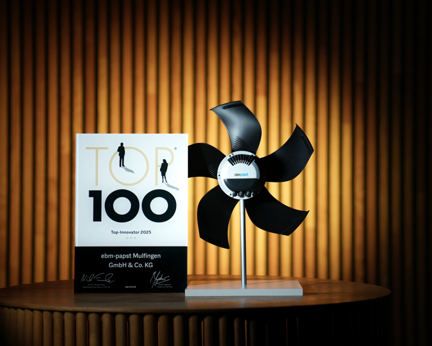 04.03.2025Innovation ist eine fest in der Unternehmenskultur verankerte Leitlinie des Ventilatoren- und Motorenherstellers ebm-papst (www.ebmpapst.com) mit Sitz in Mulfingen. Nun wurde die Innovationskraft des Unternehmens bereits zum dritten Mal mit dem TOP 100-Award ausgezeichnet. Der Wettbewerb ehrt besonders innovative mittelständische Unternehmen. In einem wissenschaftlichen Auswahlverfahren wurden die Innovationsaktivitäten anhand von mehr als 100 Prüfkriterien bewertet.