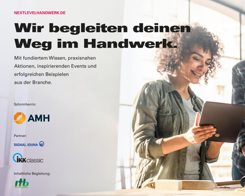Next Level Handwerk (www.nextlevelhandwerk.de) ist ein spannendes Projekt unter der Schirmherrschaft der Aktion Modernes Handwerk e.V. (AMH, www.amh-online.de). Als Service der Kreishandwerkerschaften bietet es den angeschlossenen Innungsbetrieben konkrete Unterstützung bei den so wichtigen Themen Mitarbeitergewinnung und Mitarbeiterbindung. Inhaltlich begleitet wird das Projekt vom Institut für Betriebsführung im Handwerk (itb, www.itb.de).