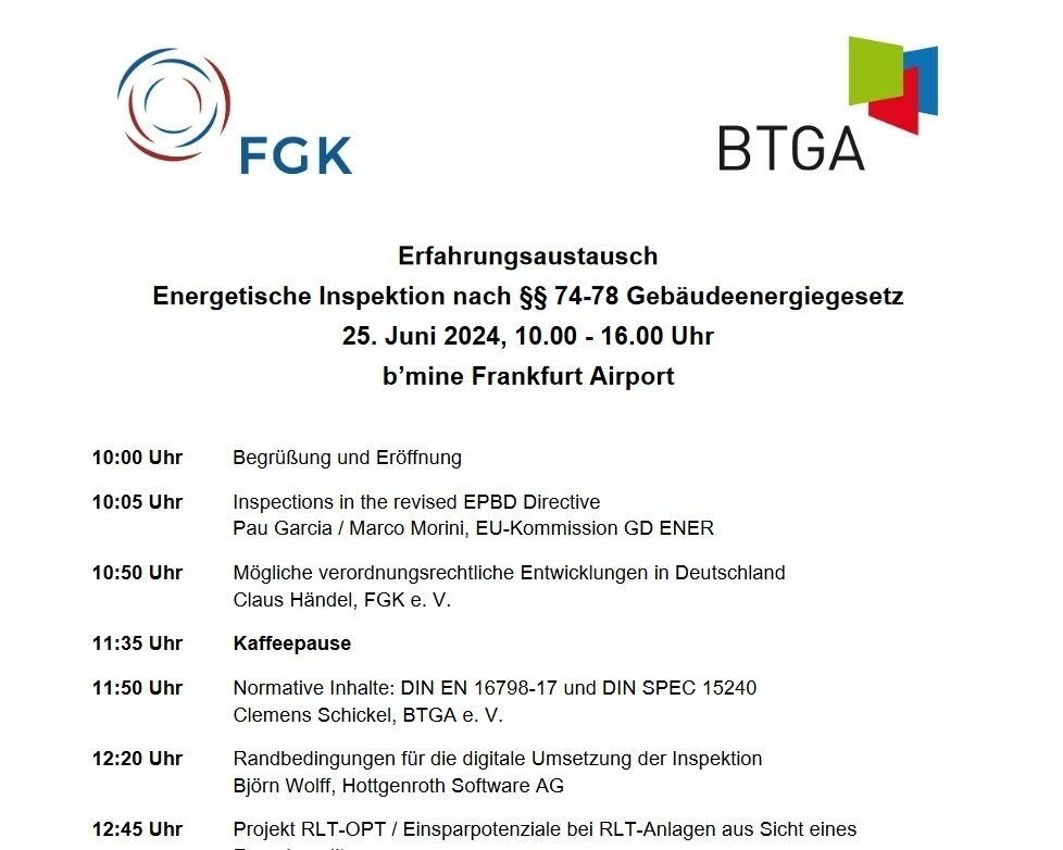 15.11.2023Der Bundesindustrieverband Technische Gebäudeausrüstung e.V. (BTGA, www.btga.de) wird auch 2024 in Zusammenarbeit mit dem Fachverband Gebäude-Klima e.V. (FGK, www.fgk.de) seine Seminarreihe zur Energetischen Inspektion von Klimaanlagen nach §§ 74-78 Gebäudeenergiegesetz (GEG) fortsetzen. Insgesamt fünf Veranstaltungen sind geplant: