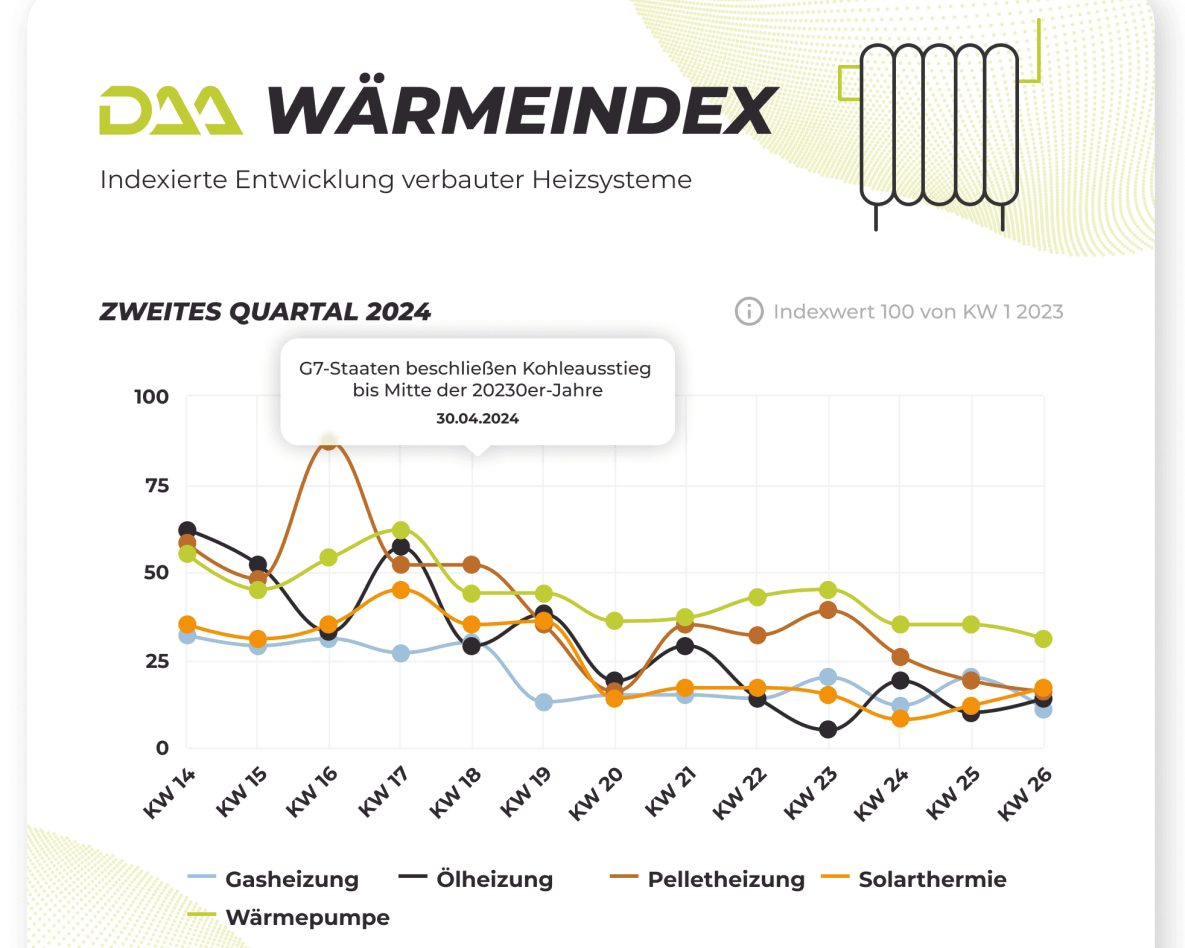 Im zweiten Quartal beobachtet DAA (www.daa.net) eine weiterhin verhaltene Nachfrage nach sämtlichen Heizungssystemen. Die Indexzahlen verbleiben bis auf einzelne Ausreißer nach oben unter der 50er-Marke. Am deutlichsten schwächeln Gasheizung und Solarthermie. Ab Mitte August steigt das Interesse an Wärmepumpen, wenngleich auf niedrigem Niveau. Dasselbe Bild zeigt sich auch bei der Pelletheizung-Nachfrage.