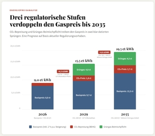 Woher die großen Mengen Bio-Brennstoffe kommen sollen, lässt das Eckpunktepapier genauso offen, wie es die Kosten der „Technologieoffenheit“ nicht klar benennt. Was die Grüngasquote für die Kosten einer Gasheizung bedeutet, hat die Deutsche Sanierungsberatung DSB (siehe Grafiken) errechnet. Die Kosten werden sich durch Grüngasquote, steigende Netzentgelte und CO2-Preise bis 2025 verdoppeln. Die DSB hat hierfür einen sehr konservativen Anstieg der Netzkosten für Gasnetze angenommen und erwartet, dass die Netzkosten noch deutlich mehr steigen als im Modell angenommen.