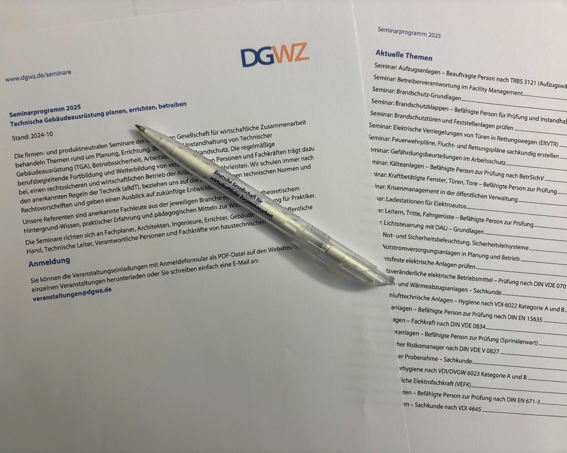 07.01.2025Die Deutschen Gesellschaft für wirtschaftliche Zusammenarbeit (DGWZ, www.dgwz.de) hat das neue Seminarprogramm für das Jahr 2025 veröffentlicht. Das Seminarprogramm umfasst bundesweit mehr als 230 Präsenzveranstaltungen und über 150 Online-Seminare. Den Schwerpunkt des firmen- und produktneutralen Seminarangebotes bilden Themen zu Planung, Errichtung und Betrieb von Technischer Gebäudeausrüstung (TGA), Brandschutz, Betriebssicherheit und Arbeitsschutz. Neu im aktuellen Programm ist das Seminar „Sicherheitsbeauftragte – Sachkunde nach DGUV 211-042“.