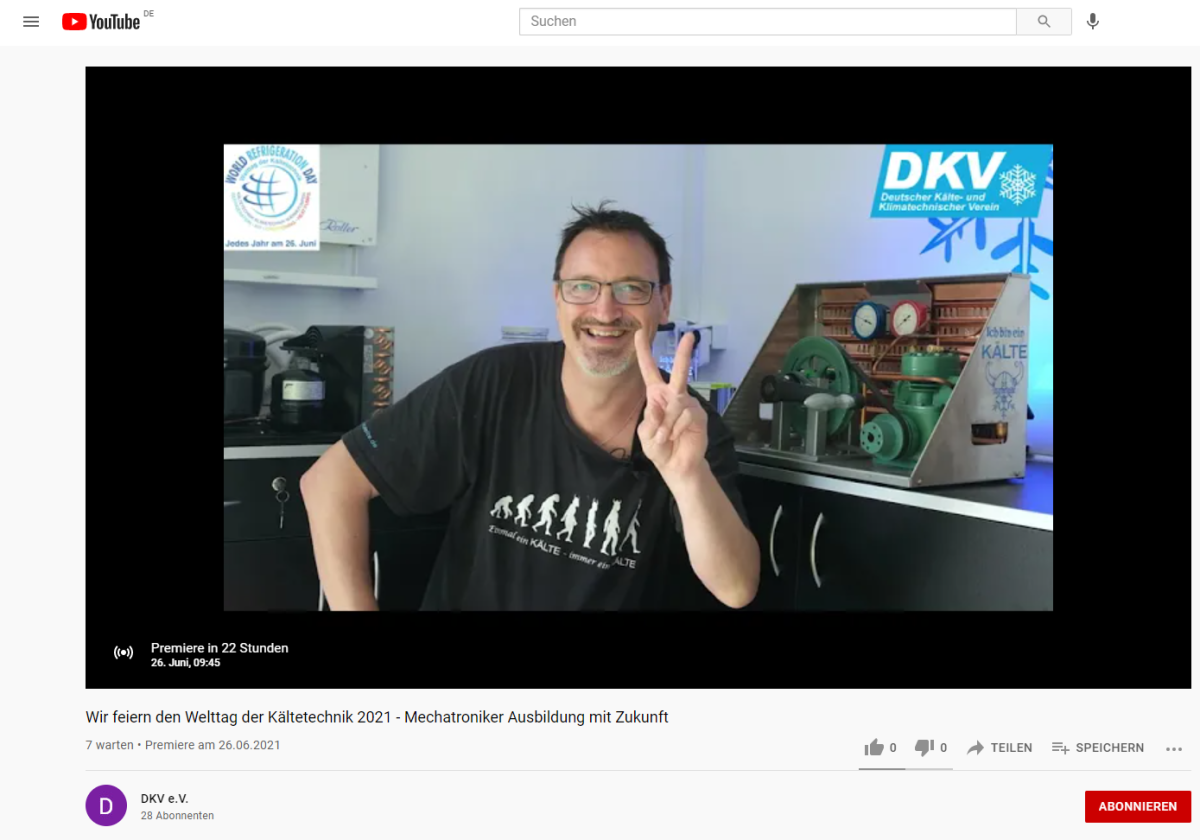 25.06.2021Am 26. Juni 2021 ist Welttag der Kältetechnik. Diesen Tag feiert der Deutscher Kälte- und Klimatechnischer Verein e.V. – DKV mit einem Video über die Unverzichtbarkeit unserer Technologie. Verschiedene Personen stellen ausgewählte Anwendungen vor, und andere erzählen, warum Sie in unserer Branche tätig sind, es Spaß macht, hier zu arbeiten und es nie langweilig wird. Das Video feiert am 26. Juni um 9.45 Uhr Premiere auf dem YouTube-Channel des DKV.