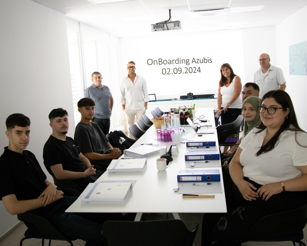 Zum Ausbildungsstart am 2. September 2024 erhielten die sechs neuen Auszubildenden ein umfassendes Onboarding und einen herzlichen Empfang ihrer Arbeitgeber Rivacold CI GmbH und Cool + Call GmbH. Auf dem Bild (v.l.) im Vordergrund die künftigen Mechatroniker für Kältetechnik Yunus Koyak, Leon Widmer und Marko Petrovic sowie für den Groß- und Außenhandel Konstantinos Theodoridis, Hayrunnisa Karabulut und Kyriaki Karagkiozidou. Dahinter für die Geschäftsleitungen (v.l.) Lorenzo Milano, Pancrazio Tondo, Isabell Walter und Stephan Heiss.