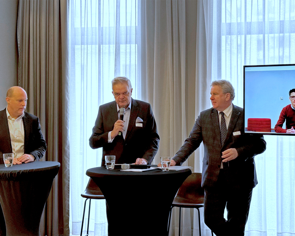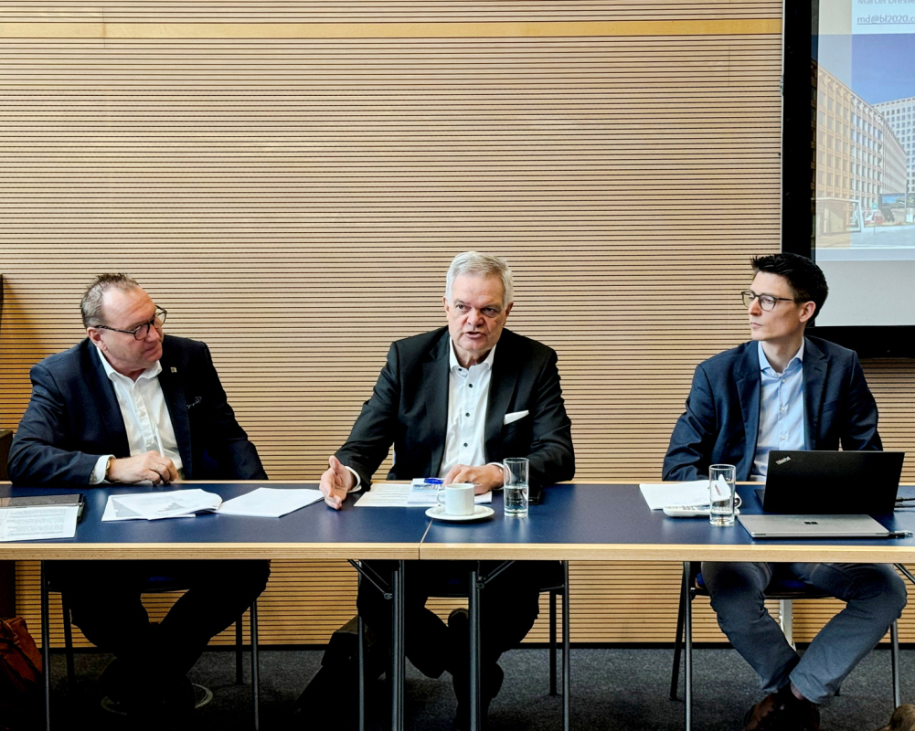 V.l.: BTGA-Vizepräsident Roland Fischer, BTGA-Präsident Bernhard Dürheimer und Marcel Dresse, B + L Marktdaten GmbH, stellen bei der „Light + Building 2024“ die Ergebnisse des BTGA-Frühjahrsgutachtens vor