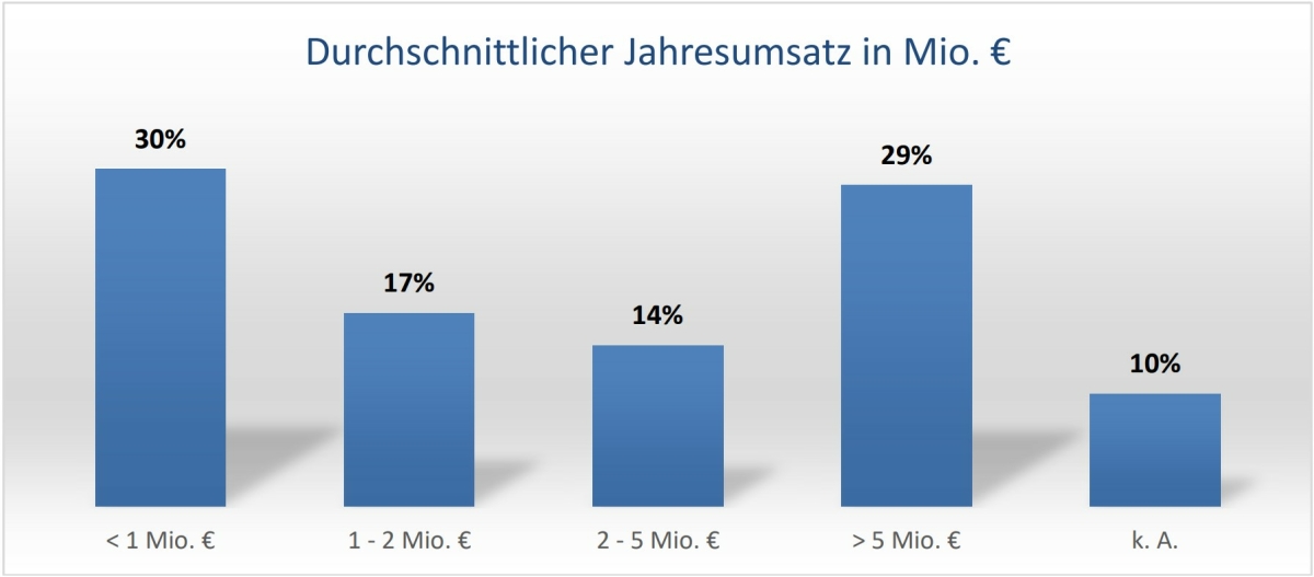 Rund 30 % der teilnehmenden Unternehmen gaben an, einen Umsatz bis 1 Mio. € erwirtschaftet zu haben, 30 % bis 2 Mio. €, 17 % bis 5 Mio. € und 19 % über 5 Mio. € Umsatz. 50 % der Betriebe beschäftigen bis zu 10 Mitarbeiter, 40 % zwischen 11 und 50 sowie 10 % mehr als 50 Mitarbeiter.