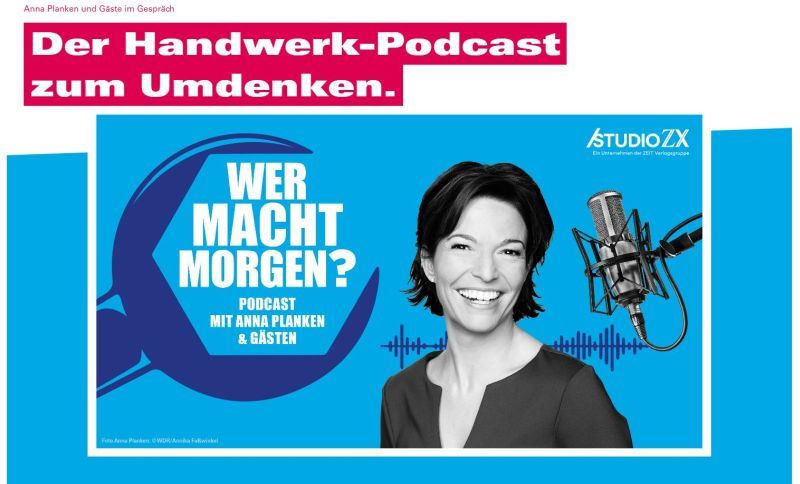 Die erste Folge von „Wer macht morgen?“ ist ab sofort auf handwerk.de, zeit.de und allen gängigen Podcast-Plattformen, u. a. auf Spotify, verfügbar. Nach dem Auftakt werden im Zwei-Wochen-Rhythmus vorerst sieben weitere Folgen mit einer Länge von jeweils 20 bis 30 Minuten publiziert. Der Podcast ist eine Kooperation des deutschen Handwerks mit Studio ZX, Teil der ZEIT Verlagsgruppe.
