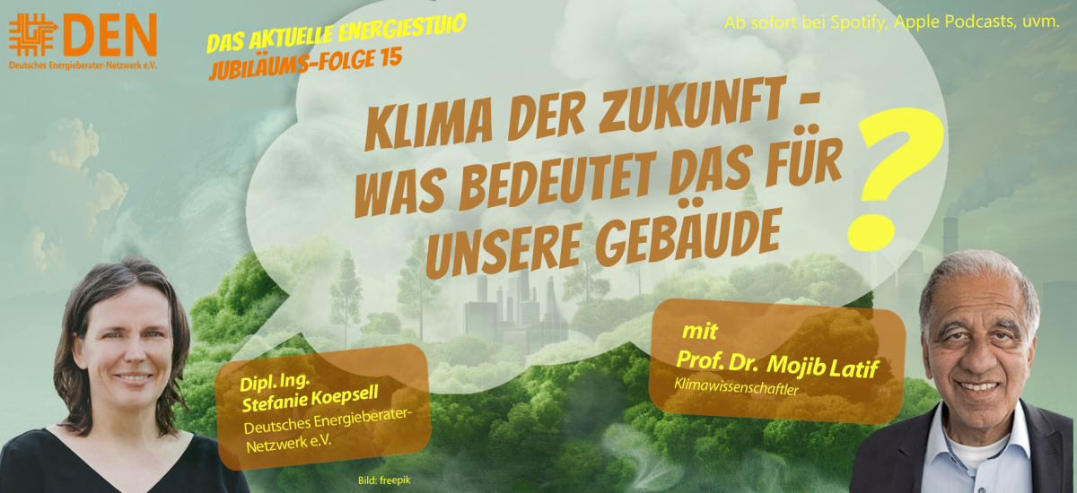 28.10.2024Seit zwei Jahren veröffentlicht das Deutsche Energieberater-Netzwerk (DEN) e.V. (www.den-ev.de) Podcasts unter dem Titel „Das aktuelle Energiestudio“ – eine Anspielung auf das legendäre „Aktuelle Sportstudio“ des ZDF, das seit Jahrzehnten ausgesprochen erfolgreich ist. Beim DEN verzeichnet man zwar keine Millionenreichweiten, freut sich aber über fünfstellige Downloadzahlen. In der aktuellen 15. Ausgabe des Energieberater-Podcasts geht Gastgeberin Stefanie Koepsell, Vorstandssprecherin des DEN e.V., mit dem Kieler Klimaforscher Prof. Dr. Mojib Latif unter anderem der Frage nach, wie der Klimawandel künftig das Bauen und Sanieren von Gebäuden beeinflusst.