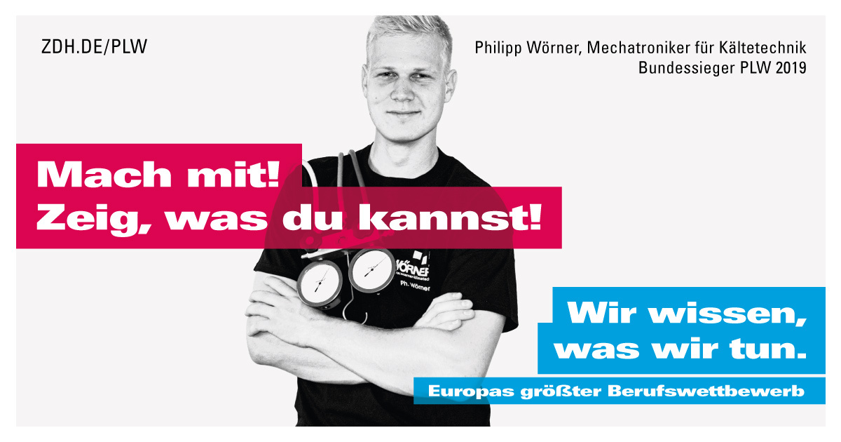 Vier Bundessieger/innen des Leistungswettbewerb des Deutschen Handwerks (PLW – Profis leisten was) aus 2019 wurden vom ZDH ausgewählt, die die Gesichter und Botschafter des Wettbewerbs sein werden. Einer dieser vier PLW-Botschafter ist der 1. Bundessieger Mechatroniker für Kältetechnik 2019, Philipp Wörner. Er und die anderen PLW-Botschaftern werden über ihre Motivation und Leidenschaft, ihren Erfolg und ihre Zukunft berichten.