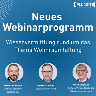 - PluggCompact – Produktwebinar für dezentrale Lüftung, 27. November 2025: Ideal für Sanierung und Neubau: Das Webinar stellt das kompakte Lüftungssystem mit Wärmerückgewinnung vor und zeigt, wie es effizient und normgerecht in Projekte integriert werden kann.