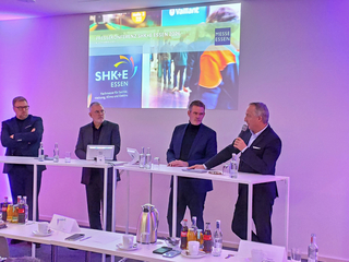 Im Gespräch erklärten sie Herausforderungen und Chancen der SHK-Branche (v.r.): Oliver P. Kuhrt (Geschäftsführer der Messe Essen), Ulrich Grommes (Landesinnungsmeister Fachverband SHK NRW), Volker Meyer (Hauptgeschäftsführer der figawa) und Markus Staudt (Hauptgeschäftsführer im Bundesverband der Deutschen Heizungsindustrie).