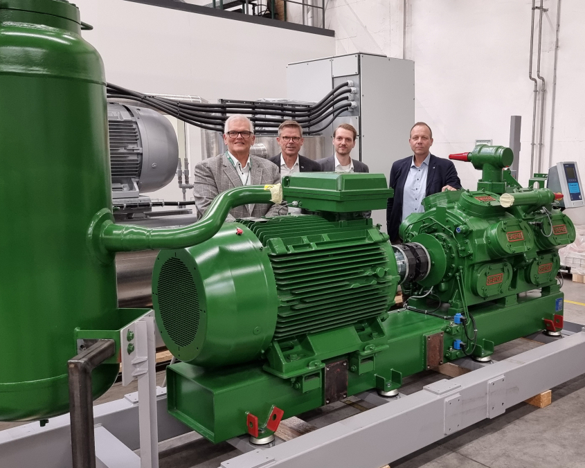 Der Landesverband Erneuerbare Energien NRW begrüßt, dass die 2G Energy AG ihr Portfolio um industrielle Großwärmepumpen erweitert hat (v.l.): Hans-Josef Vogel (Vorsitzender LEE NRW), Christian Grotholt (CEO 2G Energy AG), Maximilian Feldes (Geschäftsführung LEE NRW), Ulrich Brinkmann (Leiter Wärmepumpen 2G Energy AG)