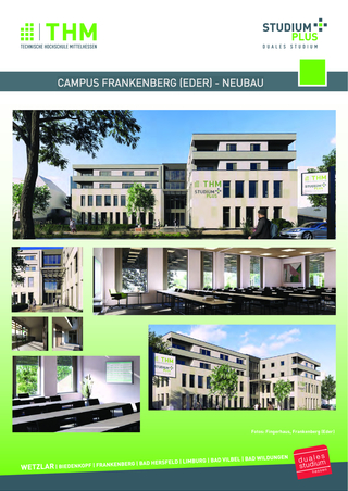 … ist das duale Studienprogramm der Technischen Hochschule Mittelhessen und des CompetenceCenters Duale Hochschulstudien – StudiumPlus e. V., dem Wirtschaftsverein der über 1.000 Partnerunternehmen. Das Programm umfasst ein vollwertiges Bachelor- oder Master-Studium an einer der größten Hochschulen für angewandte Wissenschaften in Hessen, kombiniert mit intensiver Praxiserfahrung. Mit über 1.900 Studierenden ist StudiumPlus der größte duale Anbieter in Hessen mit Hauptsitz in Wetzlar und Außenstellen in Bad Hersfeld, Bad Vilbel, Bad Wildungen, Biedenkopf, Frankenberg und Limburg. Alle Infos zu den Studienangeboten und zu den Möglichkeiten, Unternehmenspartner zu werden, findet man unter www.studiumplus.de.