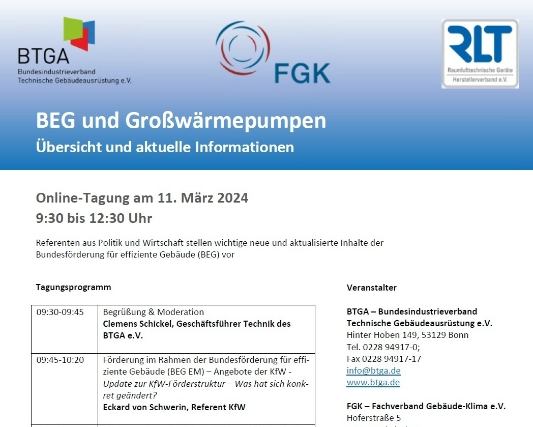 Der Bundesindustrieverband Technische Gebäudeausrüstung e.V. (BTGA, www.btga.de) wird gemeinsam mit dem Fachverband Gebäude-Klima e.V. (FGK, www.fgk.de) und dem Herstellerverband Raumlufttechnische Geräte e.V. (RLT-Herstellerverband, www.rlt-geraete.de) ein Online-Seminar "Bundesförderung für effiziente Gebäude (BEG) - Übersicht und aktuelle Informationen" durchführen. Das kostenfreie Seminar findet am 26. April 2023 von 10:00 bis 12:30 Uhr statt. Sachverständige des Bundesamtes für Wirtschaft und Ausfuhrkontrolle (BAFA, www.bafa.de) und der KfW (www.kfw.de) werden die Fördermöglichkeiten im Rahmen der BEG und die aktuellen Anpassungen der Förderprogramme vorstellen. Praktische Einblicke in die Umsetzung werden Fachleute aus der Wirtschaft geben. Weitere Informationen und eine Möglichkeit zur Anmeldung finden Sie unter www.btga.de > Veranstaltungen.