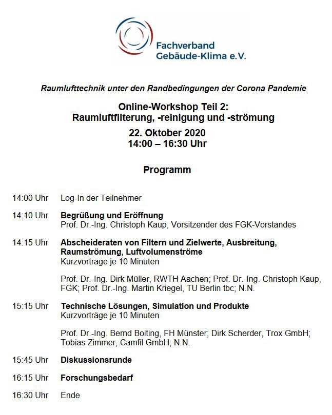 In kurzen Einführungsvorträgen stellen Forscher wissenschaftliche Erkenntnisse vor. Themen sind Hygiene, mikrobielle Wirkungsweisen und Studien. Hersteller informieren über technische Lösungen, Fragen zu raumlufttechnischen Anlagen, Direktbefeuchtung und Wasserhygiene. Auch diesmal ist wieder Zeit für die Diskussion mit den Teilnehmern eingeplant. Informationen zur Veranstaltung, das detaillierte Programm und Anmeldelink unter www.fgk.de im Menüpunkt „Veranstaltungen“. Anmeldungen bis zum 13. November 2020.