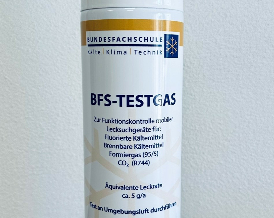 Die Bundesfachschule Kälte-Klima-Technik (BFS, www.bfs-kaelte-klima.de) hat jetzt ein vielseitig einsetzbares Testgas entwickelt, mit dem die Funktion elektronischer, mobiler Lecksuchgeräte einfach und kostengünstig überprüft werden kann und das die geforderte Nachweisempfindlichkeit erfüllt. Das Besondere daran: Es kann für Gerätetypen für fluorierte Kältemittel, Propan, Formiergas sowie Kohlendioxid gleichermaßen verwendet werden. Das BFS-Testgas, das über den Kälte-Klima-Großhandel bezogen werden kann, ist eine Gasmischung mit den messtechnisch wirksamen Stoffen R1234yf, R290, R744 und Wasserstoff. Die Füllgase sind Stickstoff und produktionsbedingt Luft.