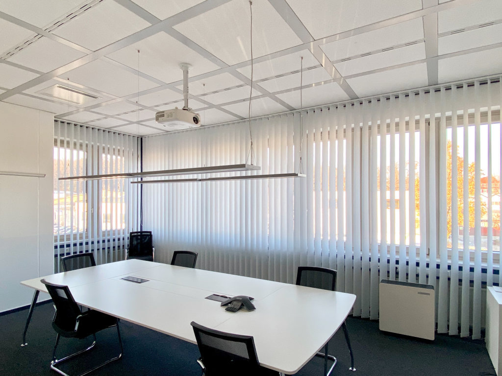 Besprechungsraum mit einem Standgerät UVC „SterilVentilation“ (rechts unten) sowie einem deckenintegrierten Gerät (links oben)