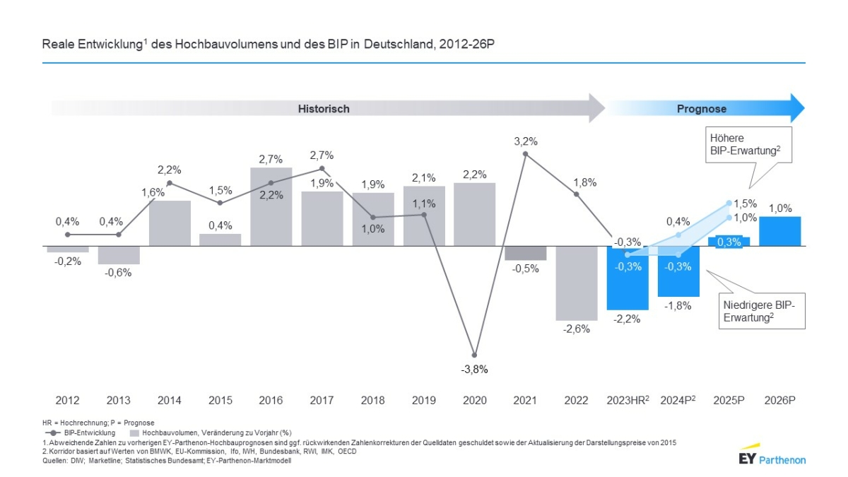Derzeit bremst die wirtschaftliche Lage den Bau von Produktionsstätten oder Büros. „Viele Unternehmen haben sich im schwierigen wirtschaftlichen Umfeld eher auf ihre Liquidität und Rentabilität fokussiert und neue Investitionen in Bauvorhaben zurückgestellt“ erläutert Volkmar Schott, Partner bei EY-Parthenon. Bereits budgetierte und fertig geplante Projekte wurden zwar teilweise noch umgesetzt, einzelne jedoch auch gestoppt oder verschoben. Erste Anzeichen der Entspannung bei Inflation und Zinsen und den damit verbundenen Bau- und Finanzierungskosten nähren jedoch die Vermutung, dass Nachfrage und Investitionsneigung langsam zurückkehren. Insgesamt erwartet EY-Parthenon für den Wirtschaftsbau nach einem weiteren Rückgang im laufenden Jahr für 2025 eine Stabilisierung. 2026 dürfte der Wirtschaftsbau erstmals wieder leicht zunehmen.