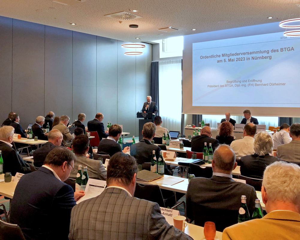 BTGA-Präsident Bernhard Dürheimer eröffnet die BTGA-Mitgliederversammlung 2023 in Nürnberg