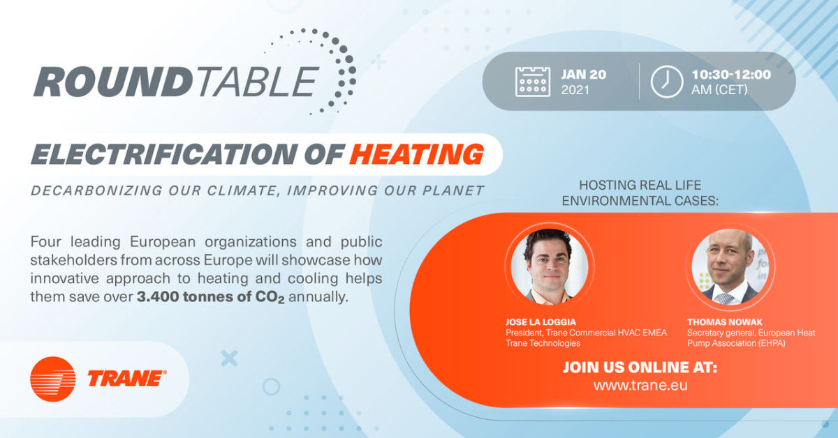 19.01.2021Trane, eine Marke des globalen Klima-Innovators Trane Technologies, veranstaltet am 20. Januar 2021 um 10:30 Uhr eine kostenlose virtuelle Diskussionsrunde zu der Organisationen und öffentliche Akteure eingeladen sind, die als gemeinsames Ziel die Bekämpfung des Klimawandels haben. Die Teilnehmer werden konkrete Umweltbeispiele für die Dekarbonisierung von Heizung und Kühlung durch Elektrifizierung vorstellen und diskutieren, wie die Energieeffizienz unserer Städte, Gebäude und Räume erhöht werden kann. Sie können Sie sich hier für die kostenlose Veranstaltung von Trane anmelden.