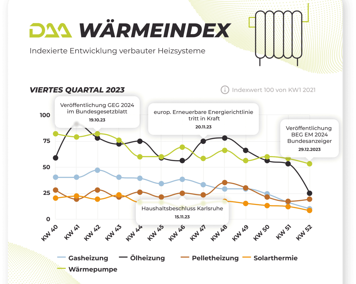 Das vierte Quartal des energiepolitisch ereignisreichen Jahres 2023 war gespickt mit wichtigen Beschlüssen. Gebäudeenergiegesetz (GEG) 2024, eine neue europäische Energierichtlinie, die Veröffentlichung der novellierten Bundesförderung für effiziente Gebäude (BEG) und nicht zuletzt der folgenreiche Haushaltsbeschluss des Bundesverfassungsgerichts schlossen das turbulente Jahr gebührend ab. DAA sieht in den letzten drei Monaten des Jahres weiterhin viel Bewegung im Heizungsmarkt.